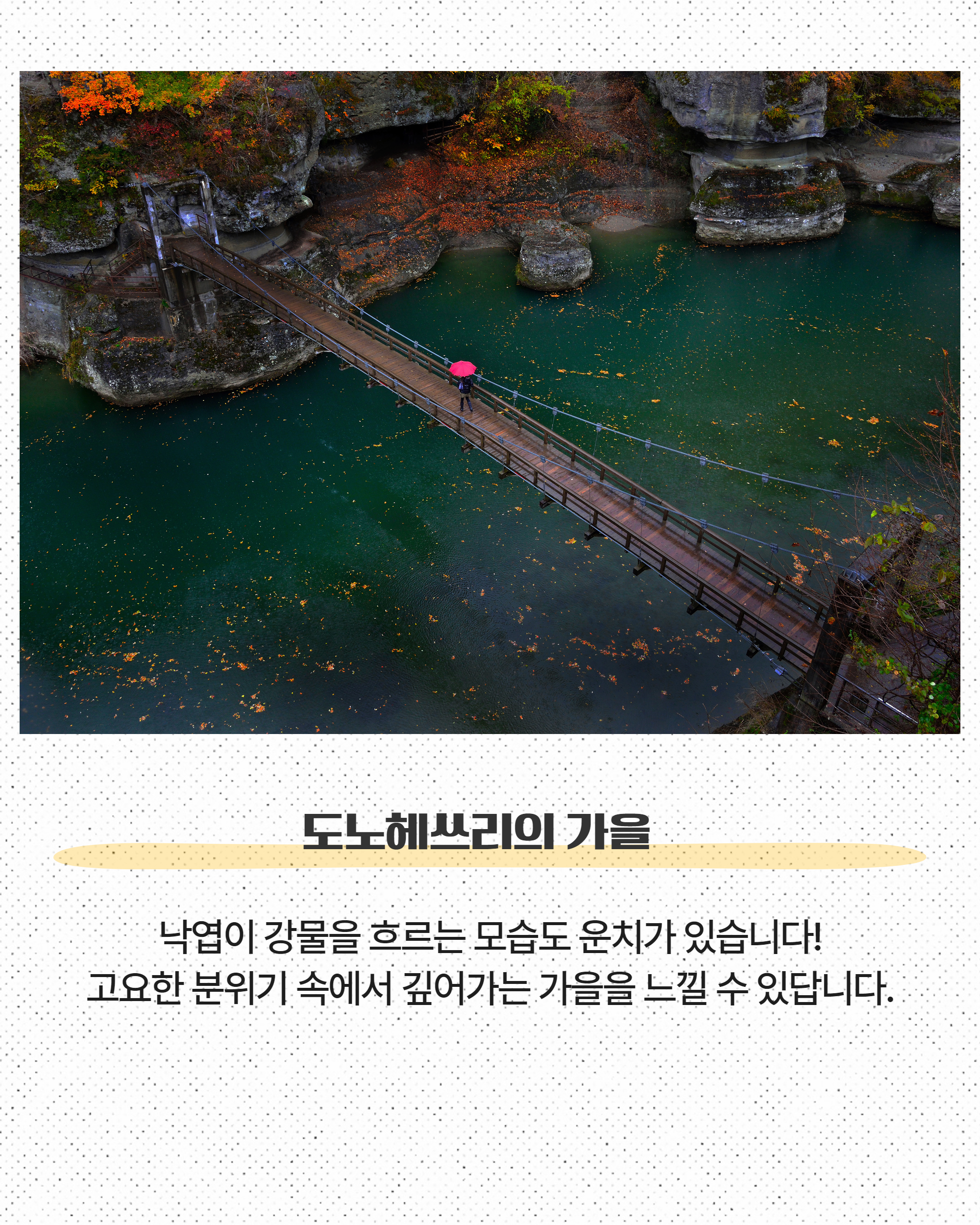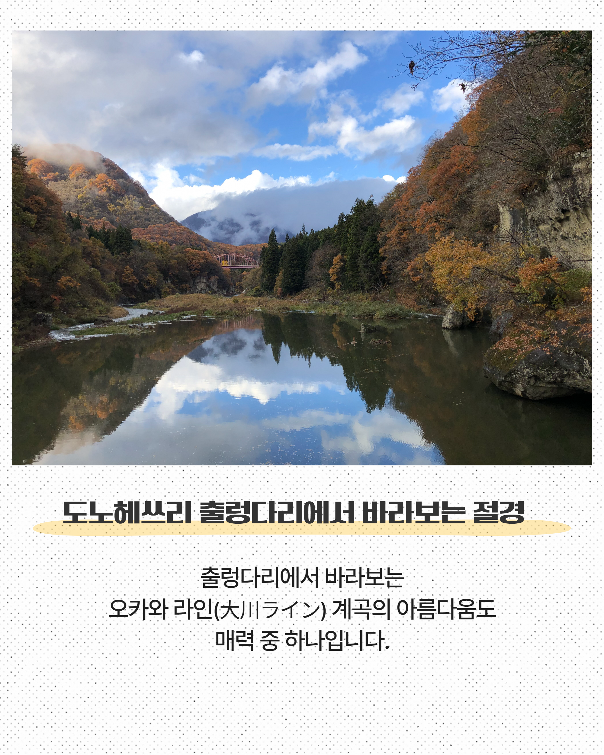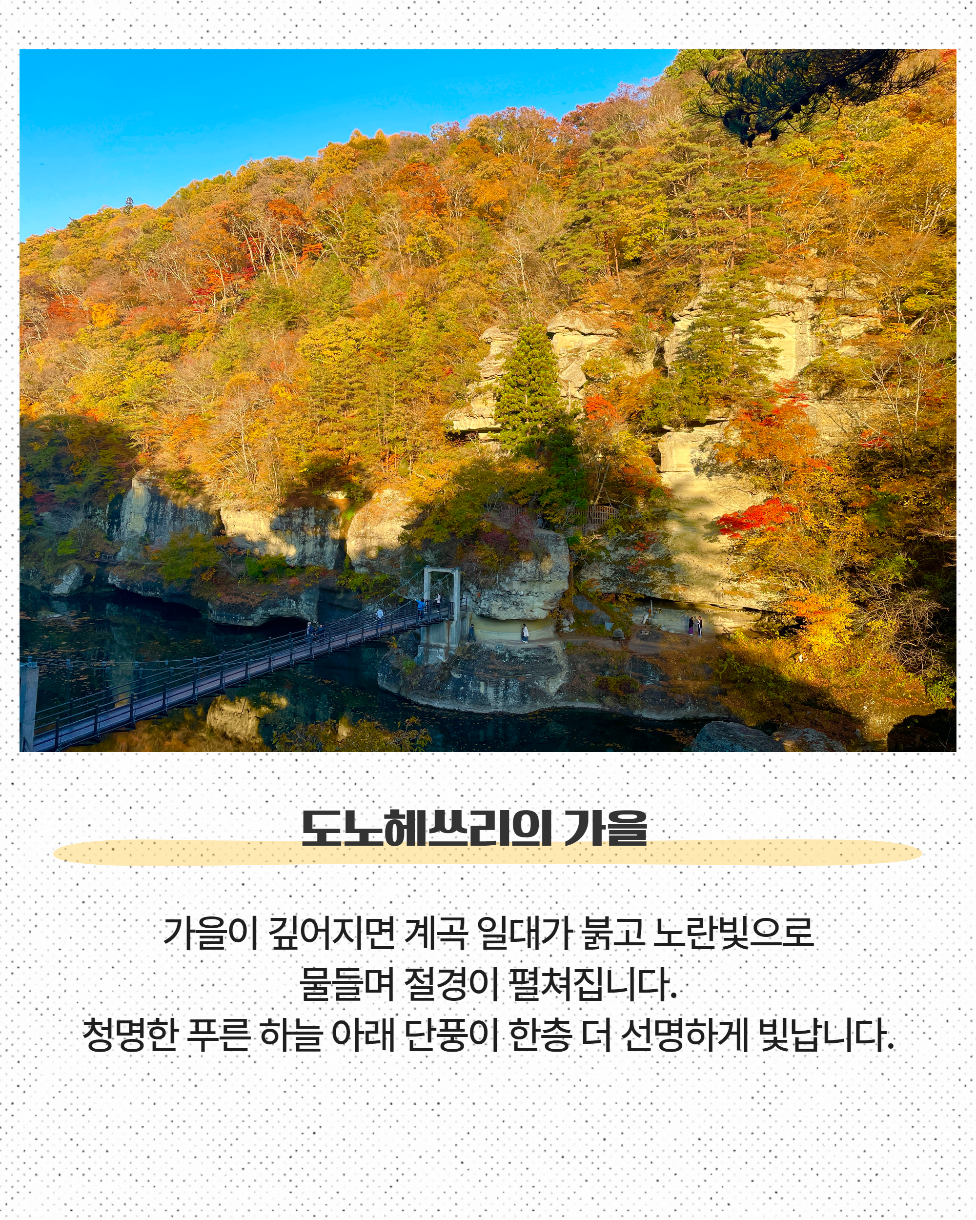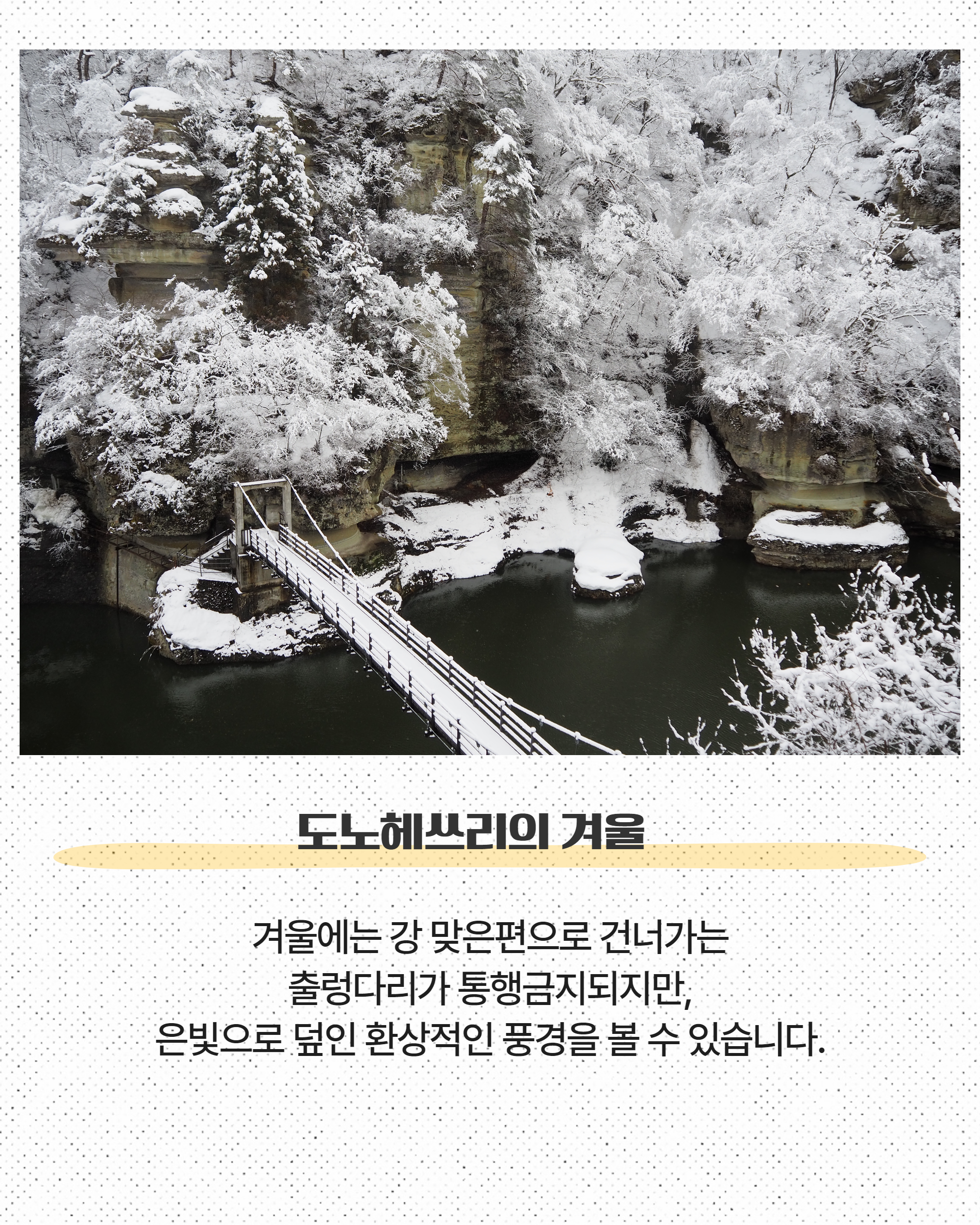 特に新緑の春や紅葉の秋は色彩豊かな絶景が楽しめます。冬期は吊り橋が閉鎖されますが、雪化粧の幻想的な風景も魅力のひとつ。