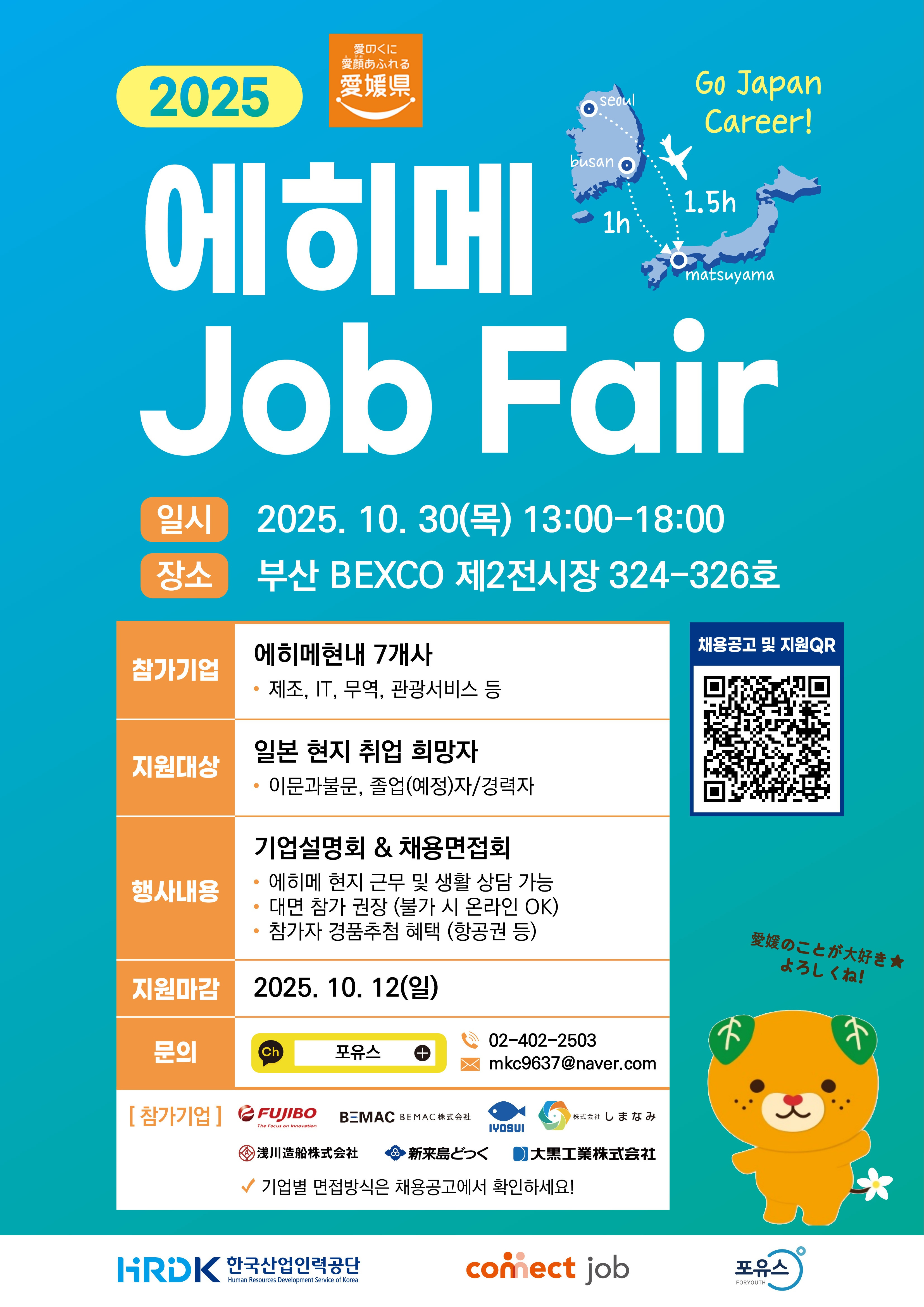 愛媛県では、日本で働きたい韓国の求職者を対象に、10月30日にベクスコ(釜山)で愛媛県の企業との面接会を開催します!