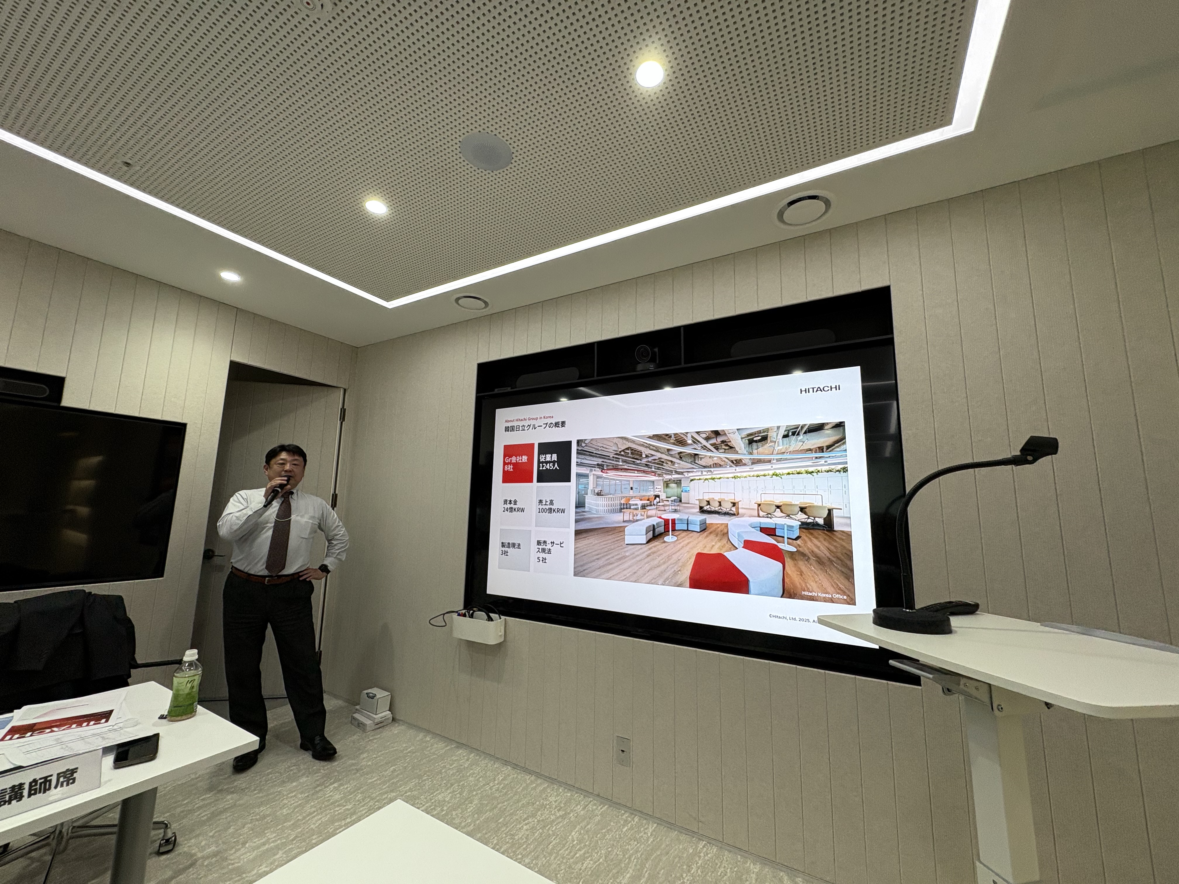 まず、韓国日立、大谷徹代表理事社長にご講演いただきました。日立グループの紹介や1962年に日立コリアが設立されてから行われた事業などの説明、韓国でのミッションについて説明を受けました。