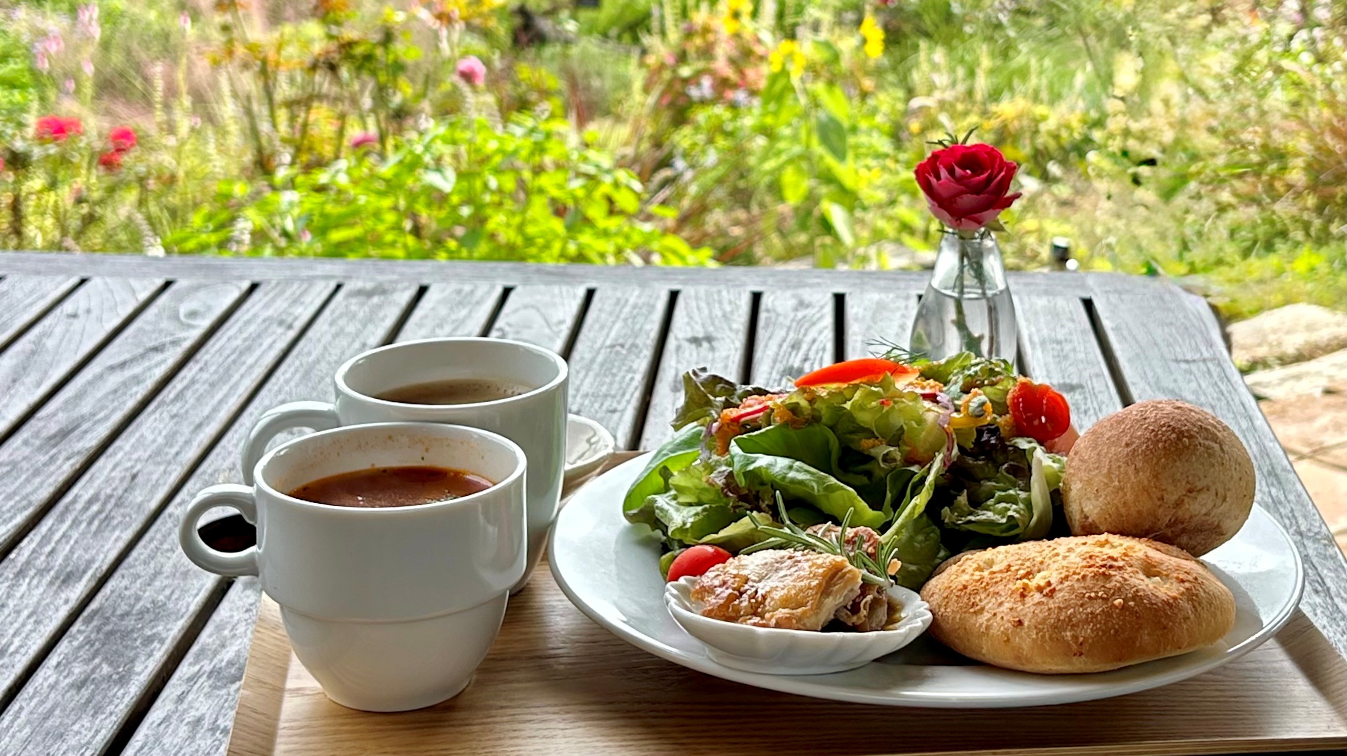 バルコニー越しに聞こえる小鳥のさえずり、そっと頬をなでる風、きちんと手入れされた庭の景色――そのすべてが重なり合って、深く呼吸できたその瞬間は、今もふと思い出す癒しの記憶なのです。