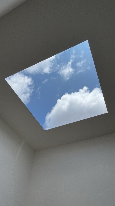 中でも私が一番好きだったのは、ジェームズ・タレルの作品「Blue Planet Sky」という空間です。天井の中央に四角い穴が開いており、そこから見える空の色が時間とともに変化していく様子を静かに眺めることができます。